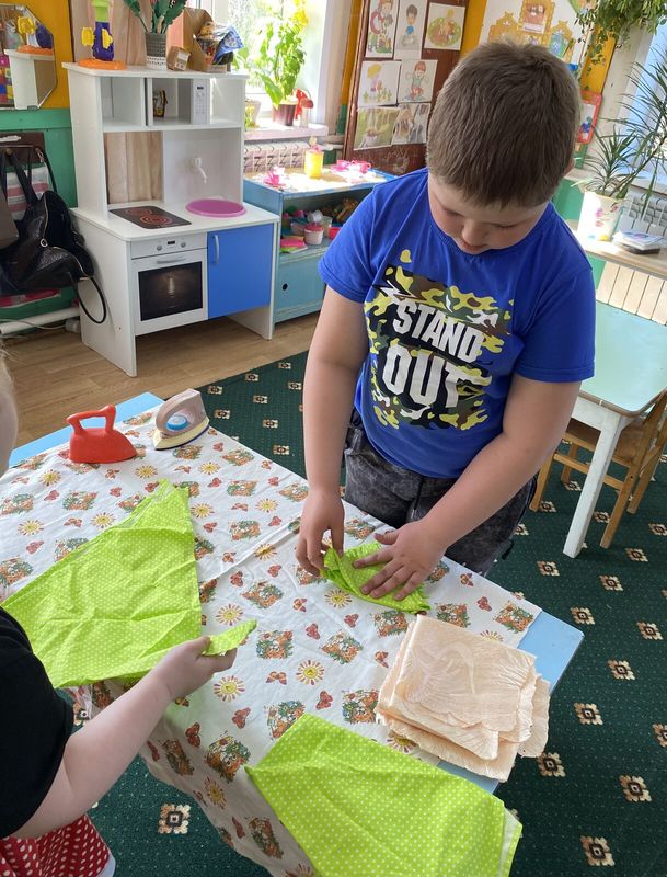 Познакомили детей с процессом глажки и складывания вещей, объяснили зачем нужно гладить и складывать бельё (чтобы было красивым, мягким, и опрятным), и что глаженое бельё приятно пахнет свежестью.